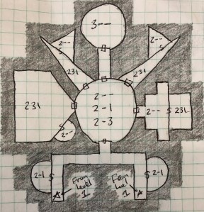 Each room in the dungeon holds a key – three numbers in order. These numbers refer back to a specific word list. As players enter a room, words are rolled on a list, to determine what is encountered in that room.