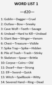 For example – a room has a key of 1-2-1. The first word is rolled from Word List One. The second word is rolled from Word List 2. And the third word is rolled from Word List One again. After rolling all three words, the results might be, witch – fangs – rusty. And so, an encounter is created from the rolls.