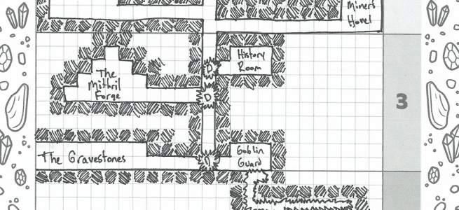 In Dwarf Mine, you will draw your mine on graph paper, roll dice to determine what gold, gems, or other treasure you’ve discovered, and (hopefully) defeat monsters in combat, keeping your mine alive and thriving!